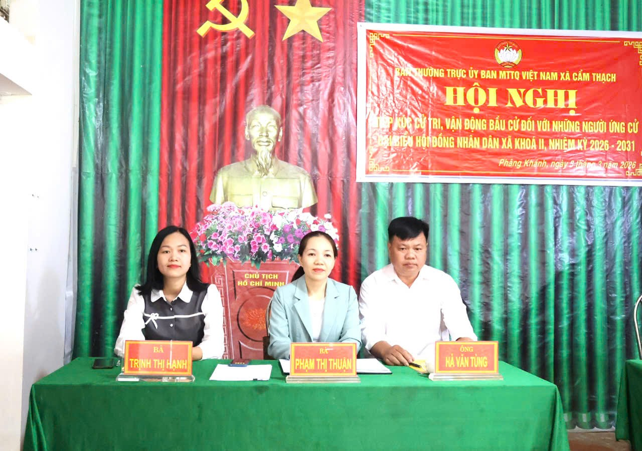 Ngày 7/3/2026, Ban Thường trực Ủy ban Mặt trận Tổ quốc Việt Nam xã Cẩm Thạch tiếp tục tổ chức Hội nghị tiếp xúc cử tri vận động bầu cử đối với những người ứng cử đại biểu Hội đồng nhân dân xã Cẩm Thạch khóa II, nhiệm kỳ 2026 – 2031 tại 5 đơn vị bầu cử gồm:
